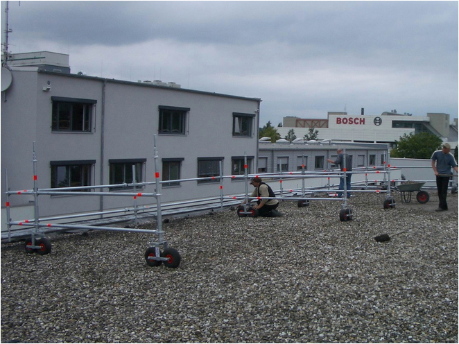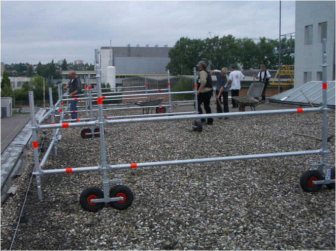 Sicherheit mit System, auch auf dem Flachdach, mit dem bewährten Allround-Gerüst.