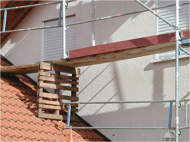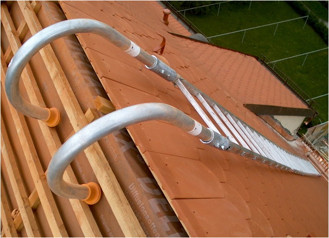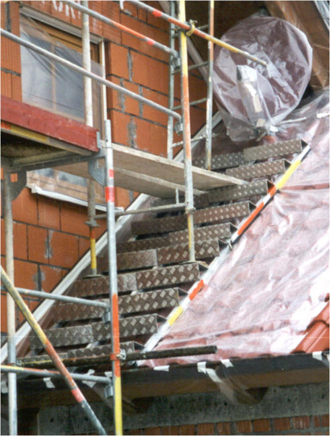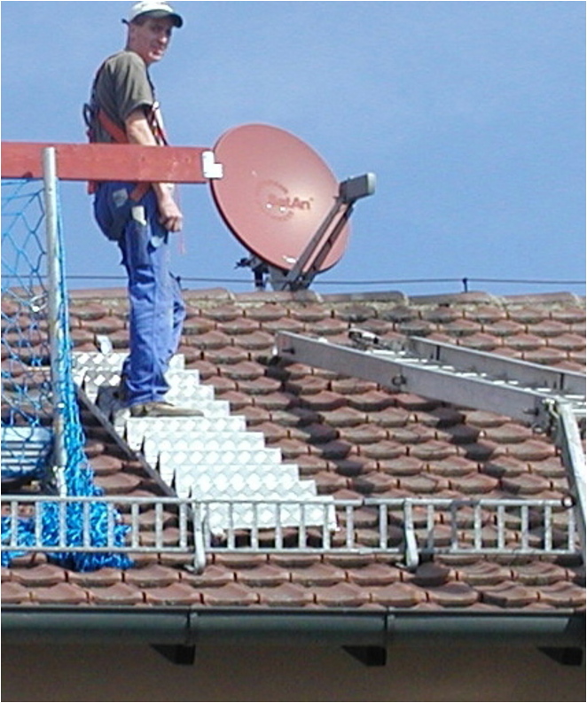 Der Layher Alu-Dachaufstieg ist nicht nur ein sicherer Verkehrsweg, sondern auch ein ergonomisch wichtiger Arbeitsplatz, der entspanntes Arbeiten auf dem Schrägdach in stehender oder sitzender Position ermöglicht.