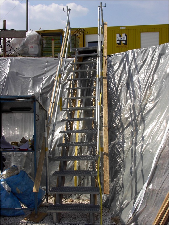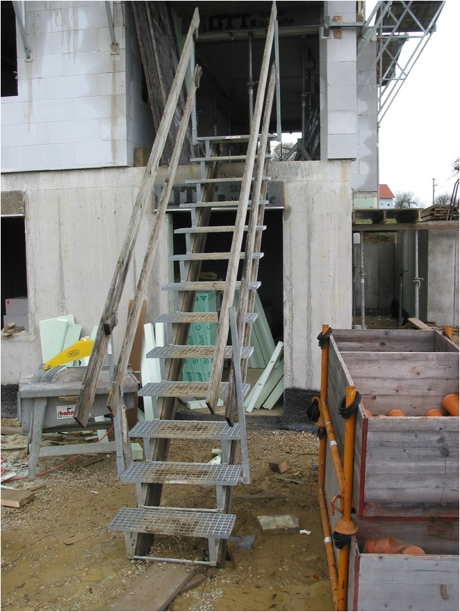 Die Layher Baustellen-Treppe ist ideal, um Geschosse, Böschungen und Baugruben sicher begehen zu können. Einfach auf zwei bauseitigen Kanthölzern (Schalungsträgern), unten beginnend, annageln.