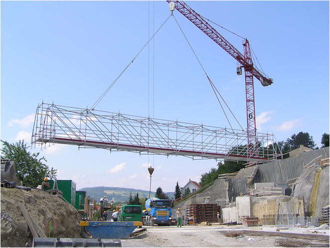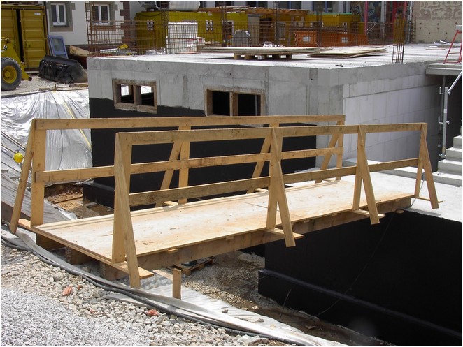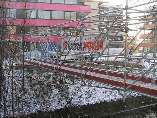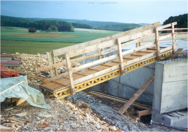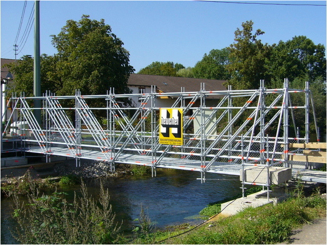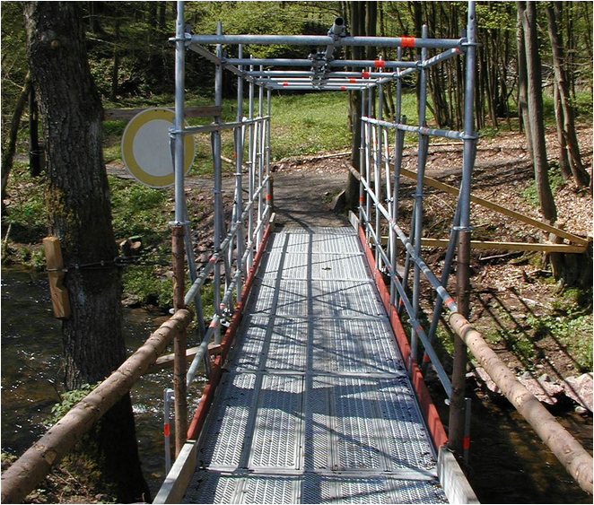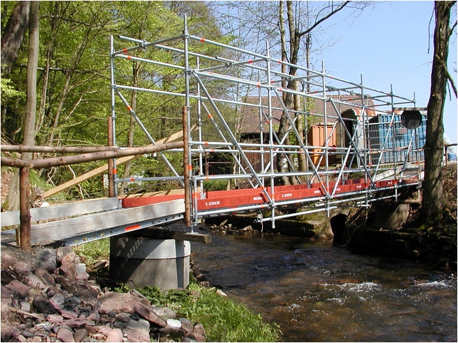 Wenn die einfache Grabenbrücke mit einer Belastung bis 2 kN/m? mal nicht ausreicht, erstellen wir Ihnen mit dem Layher Allround-Gerüst auch Behelfsbrücken bis 5 kN/m2.