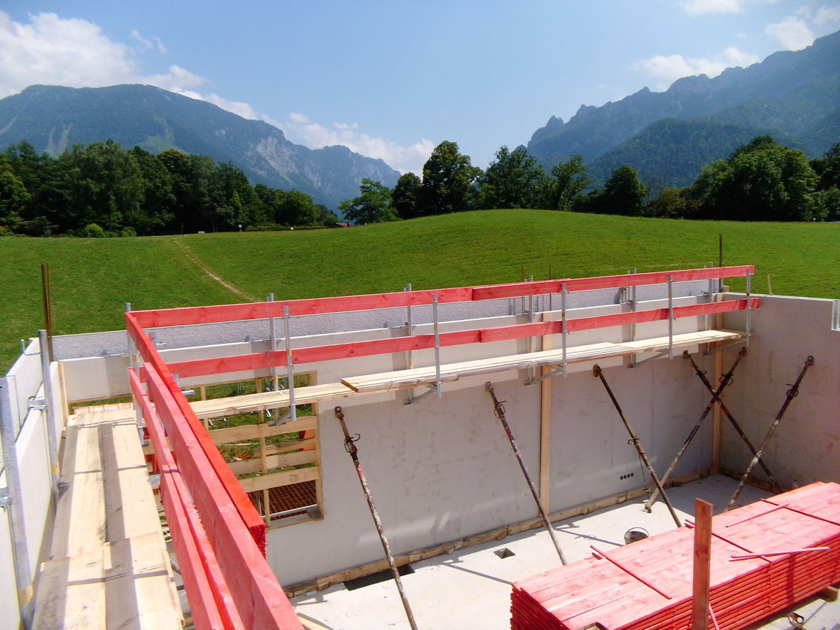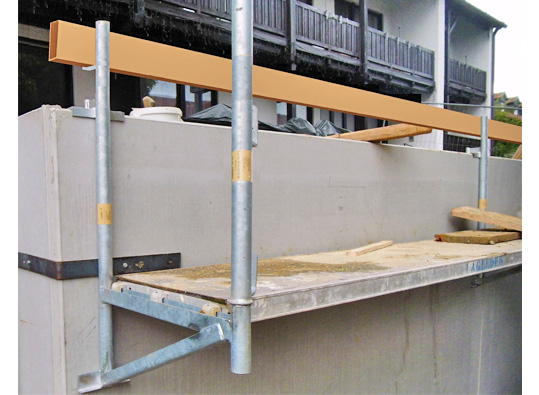 Einfache bzw. schnelle Montage an bewehrten Hohl- bzw. FT-Wänden bis 8 cm Stärke. Konsolen über die Wände hängen, Einhängehaken mit bauseitigem Leerrohr (inkl. Verschlussstopfen) versehen, mit Layher Gerüstböden bzw. systemfreien Gerüstbohlen belegen, fertig!