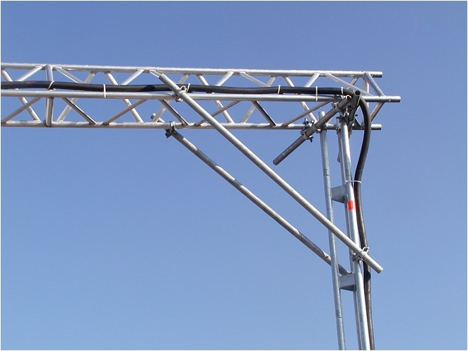 Eine schnelle und einfache Form einer Kabelbrücke erstellen Sie mit der Layher Dreieckstütze in Verbindung mit Alu-Dreieckgitterträger und bauseitigem Betonballast.