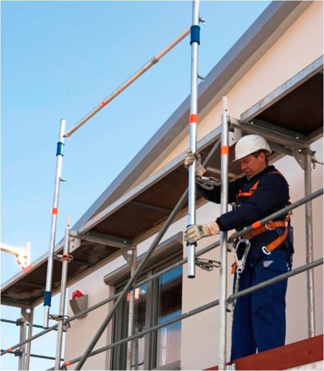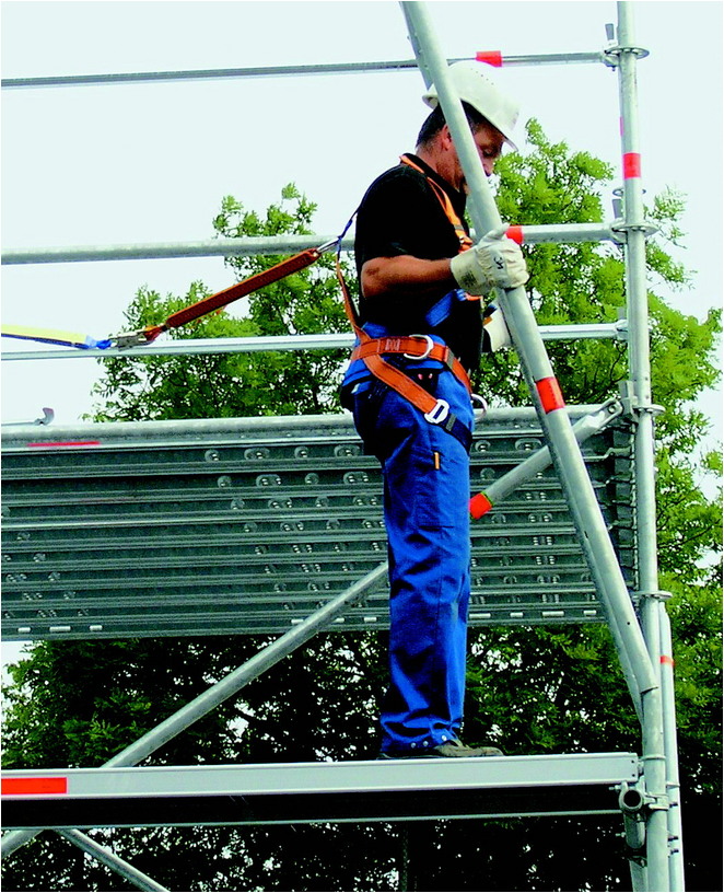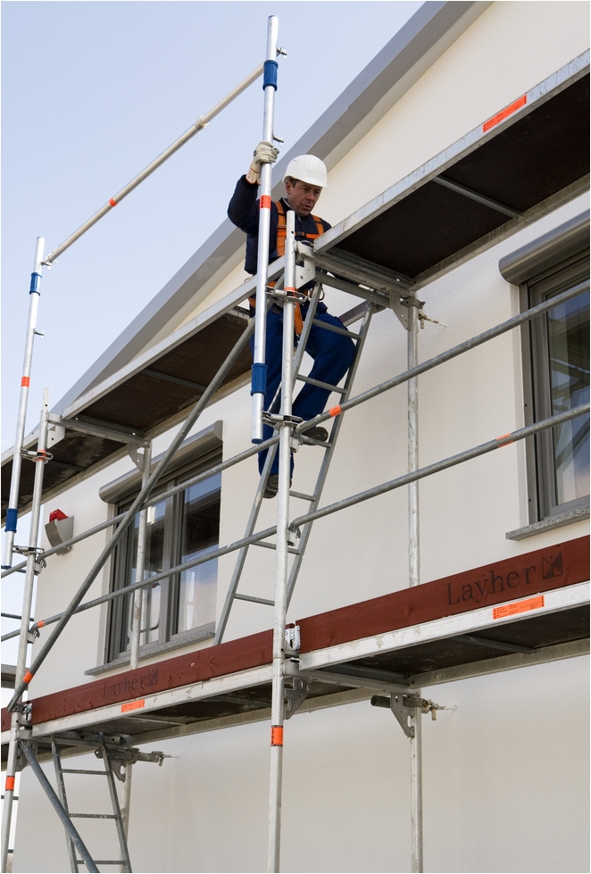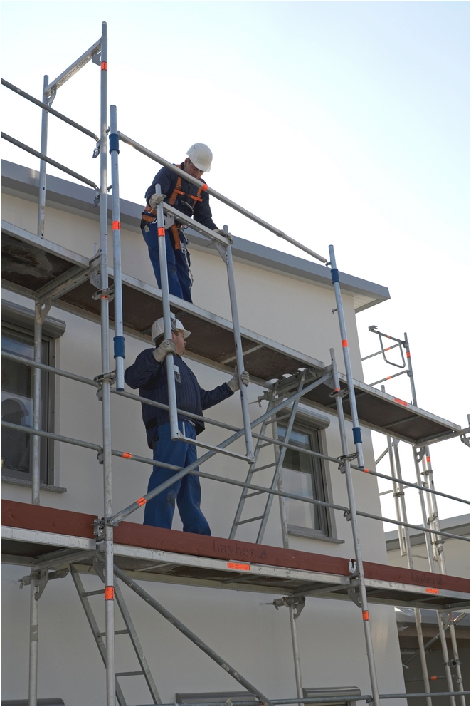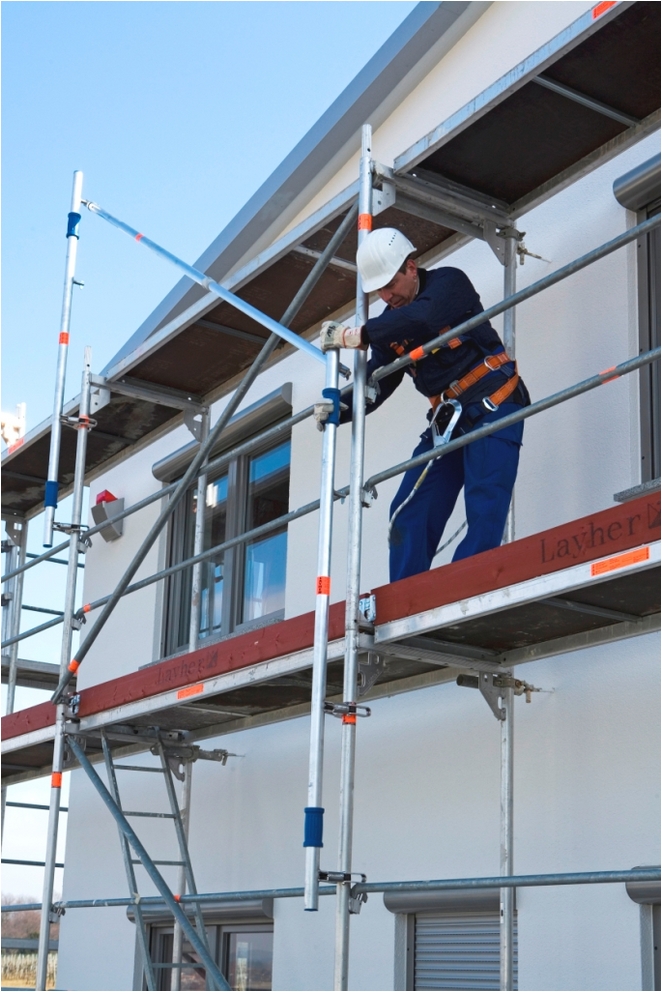 Zur Abwehr potentieller Absturz-Gefahr während dem Gerüstauf- bzw. abbau, beim Aufstieg in die oberste – noch ungesicherte – Lage aus dem Leitergang hat Layher das Montage-Sicherungs-Geländer (MSG) entwickelt.
