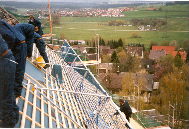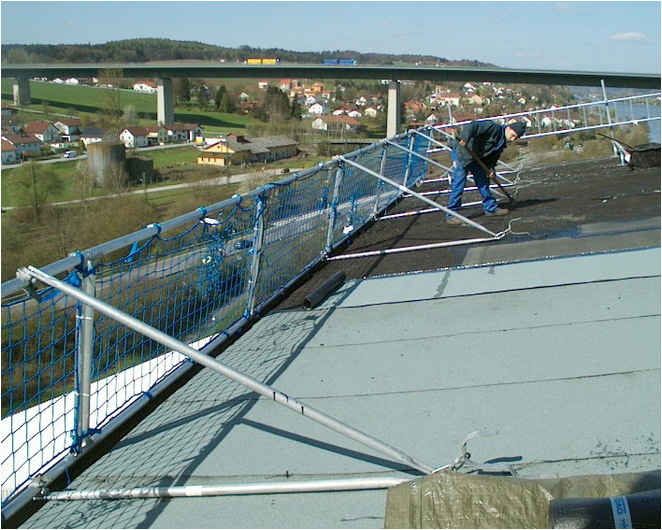 Der Layher Netzschutzwand-Rahmen ist eine Dachschutzwand dem Schrägdach von 20 ° – 60 °. Diese Schutzwand dient als Ersatz oder Ergänzung für das Layher- Blitzgerüst. Lange bzw. hohe Schrägdächer (> 5,00 m) erfordern zu den Traufschutzwänden zusätzliche Dachdeckersicherungen.