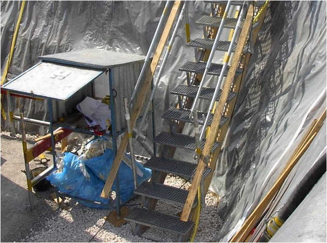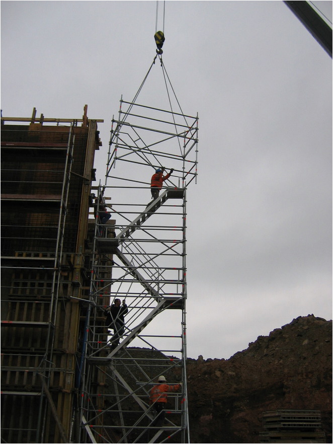 Die Layher Allround Rohbau-Treppe entspricht den Vorschriften “Treppen bei Bauarbeiten” und passt in kleinste Treppenlöcher im Wohnungsbau.