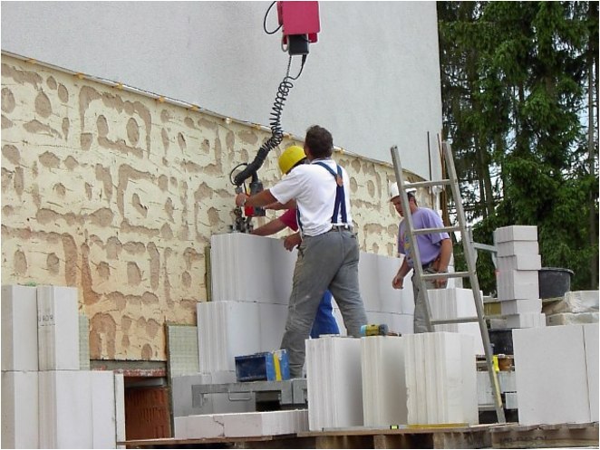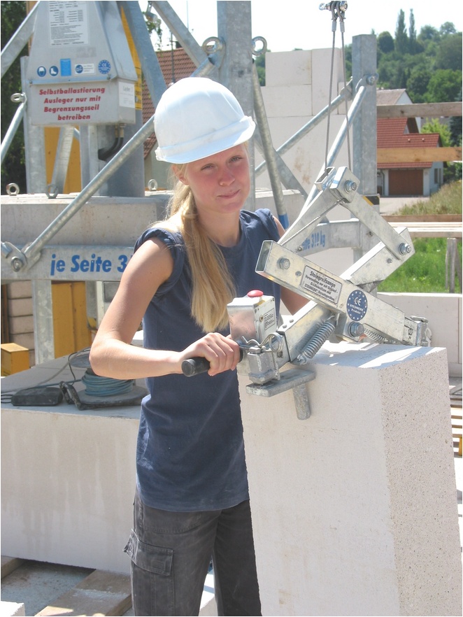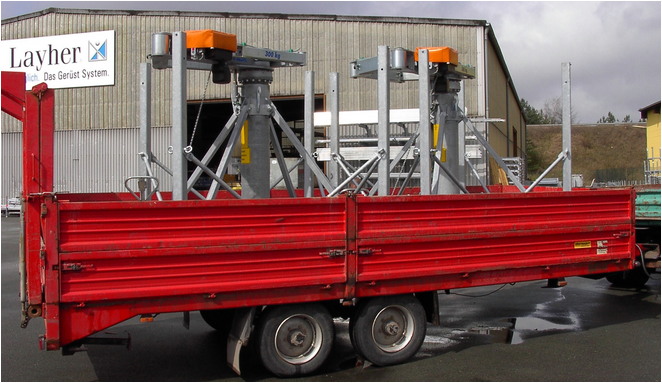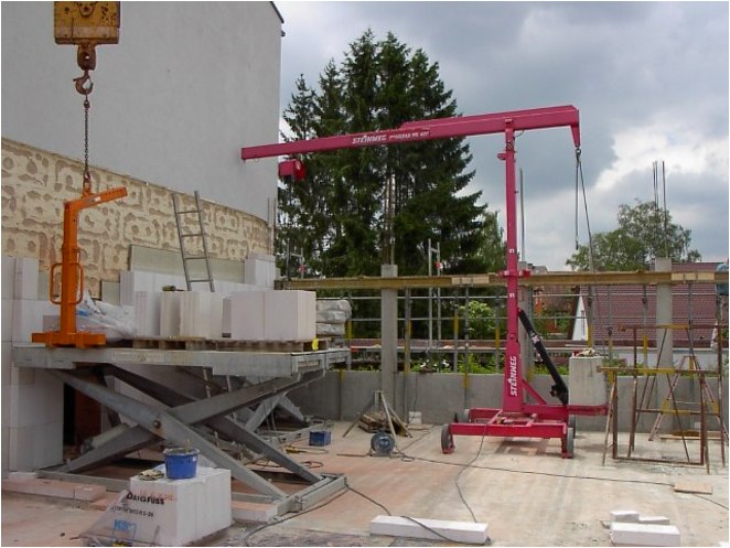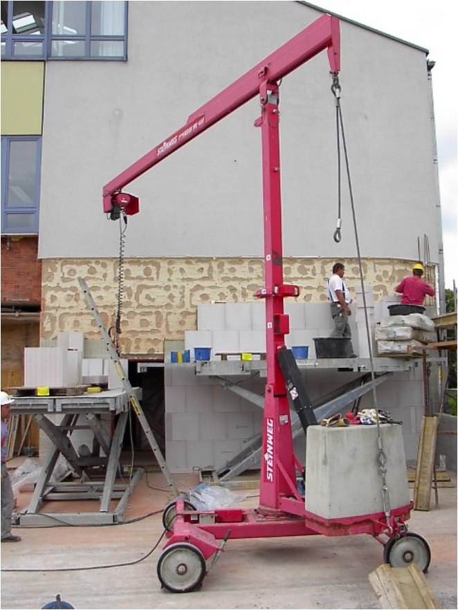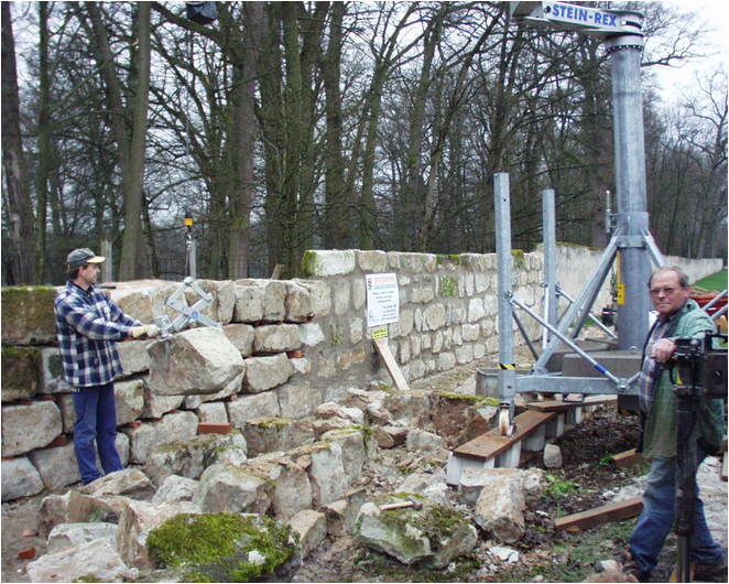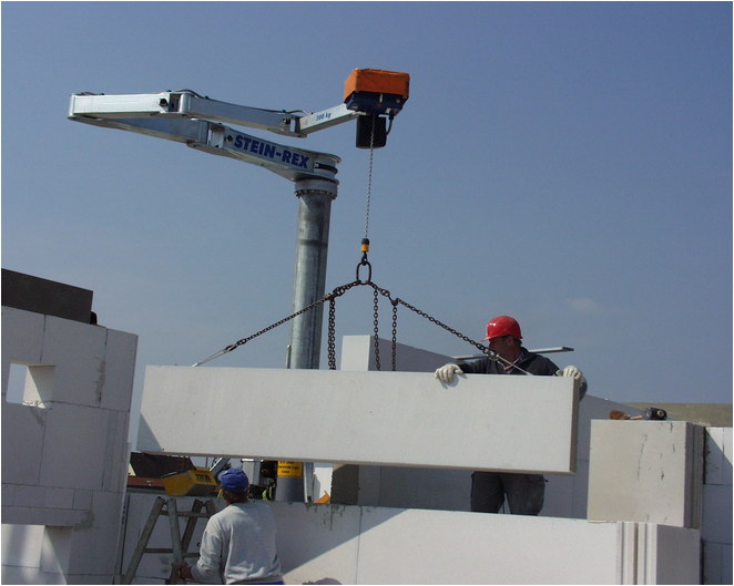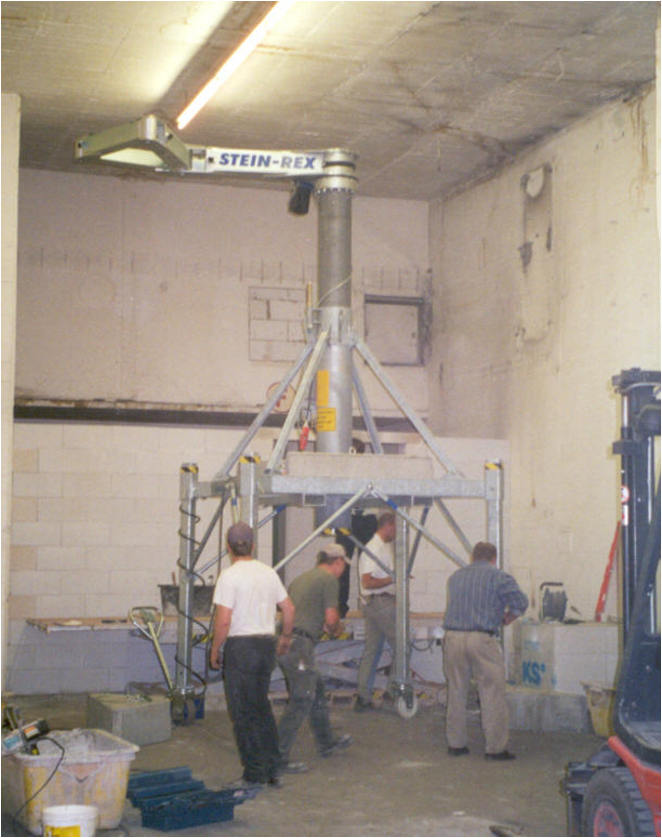 Kleinkräne werden auf der Baustelle durch Großkräne montiert und mit Ballast versorgt. Der Mehrfach-Gelenkausleger entlastet diesen Großkran, der Stein-Rex ballastiert sich selbst.