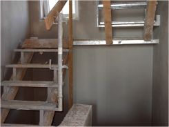 Der Layher-Teleskophalter ist – in Verbindung mit Gerüstbohlen – eine schnell erstellte Arbeitsplattform in hohen Treppenhäusern u.ä.