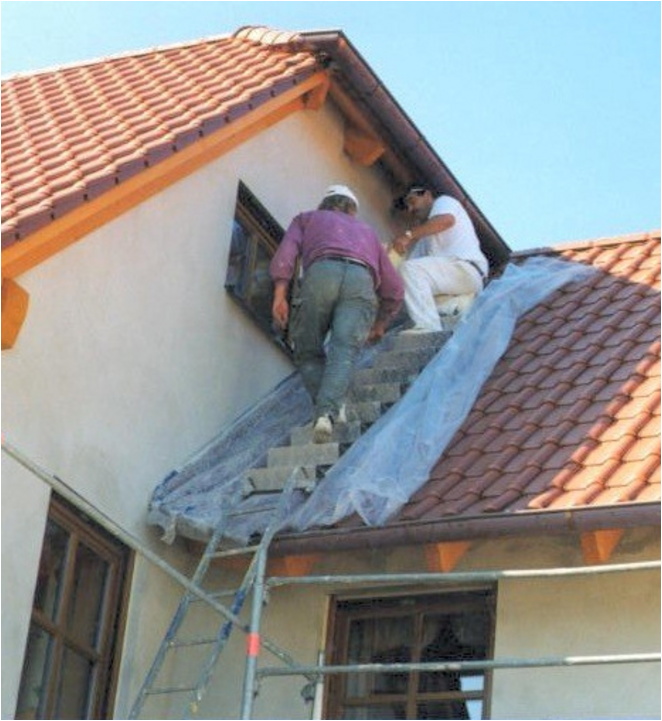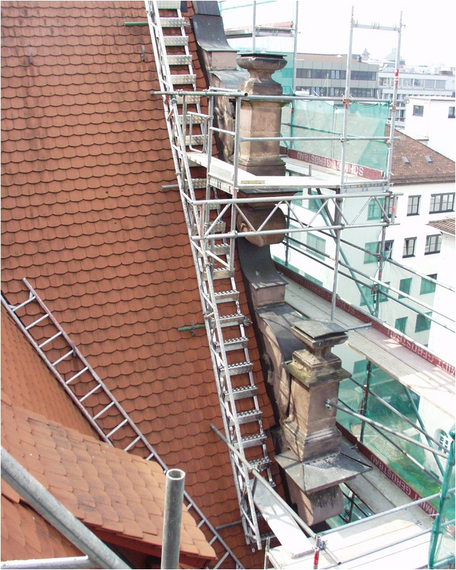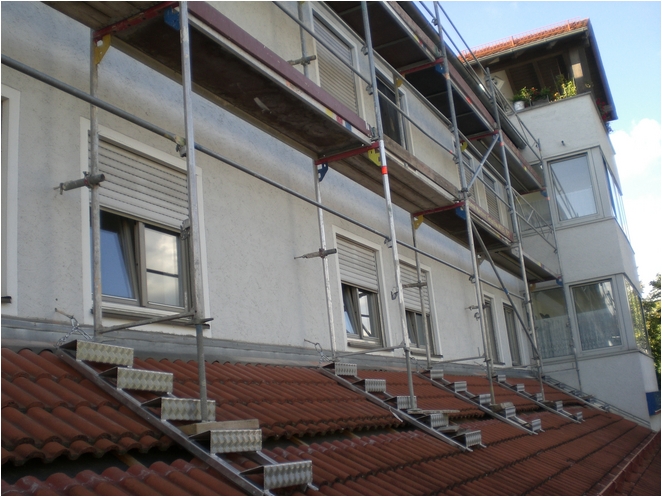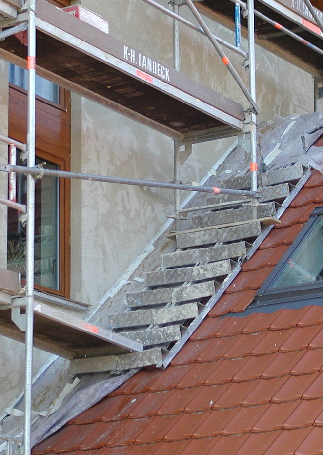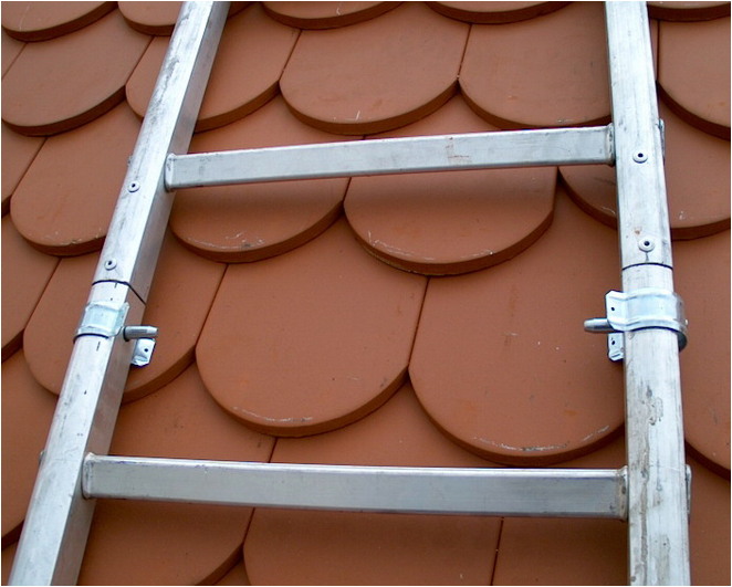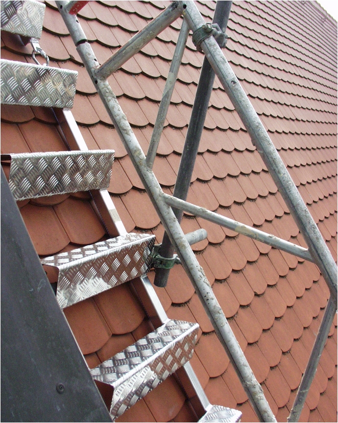 Der Layher Alu-Dachaufstieg ist nicht nur ein sicherer Verkehrsweg, sondern auch ein ergonomisch wichtiger Arbeitsplatz, der entspanntes Arbeiten auf dem Schrägdach in stehender oder sitzender Position ermöglicht.