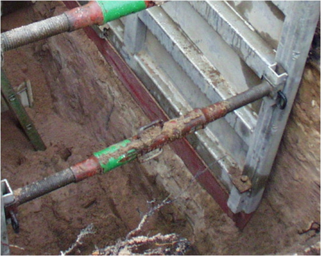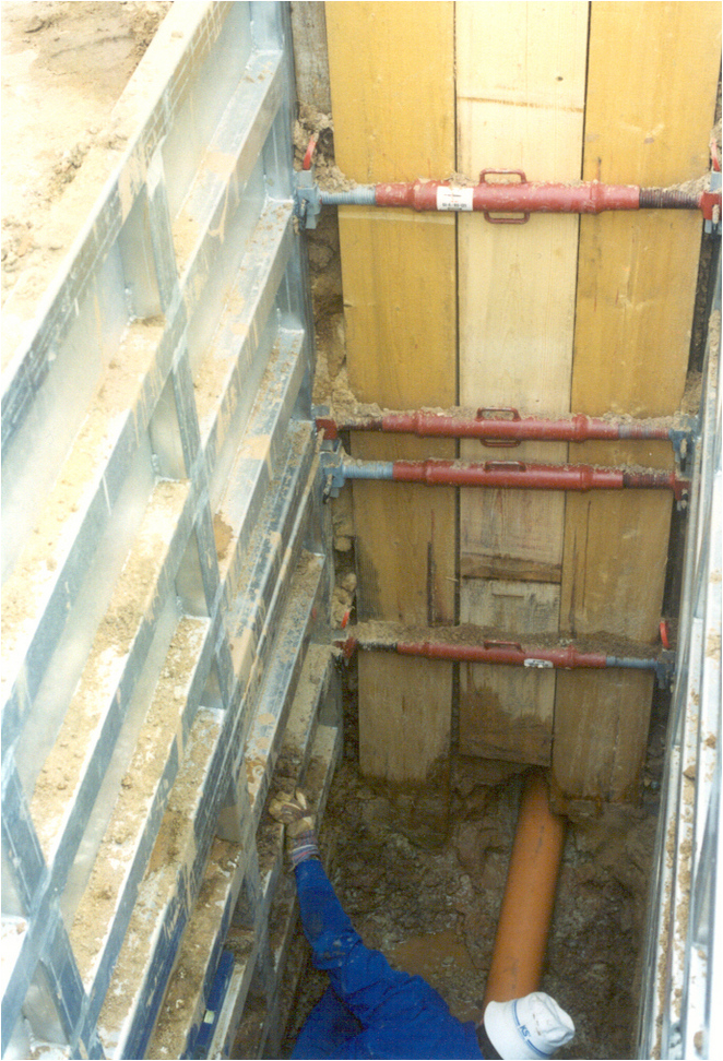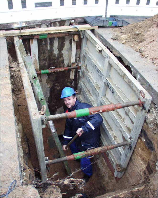 Der Layher Alu-Verbau ist ein extrem leichter und trotzdem sicherer, GS-geprüfter Grabenverbau bis 3,00 m Grabentiefe. Gräben mit einer Grabentiefe > 1,25 m müssen gegen Einsturz gesichert werden. Darunter fallen auch Gräben für Hausanschlüsse. Der dafür oft verwendete Minibagger kann eine komplette Verbaueinheit mit 3,00 m Länge und 1,50 m Höhe, inkl. Spindel (ca. 265 kg) ein- und ausbauen.