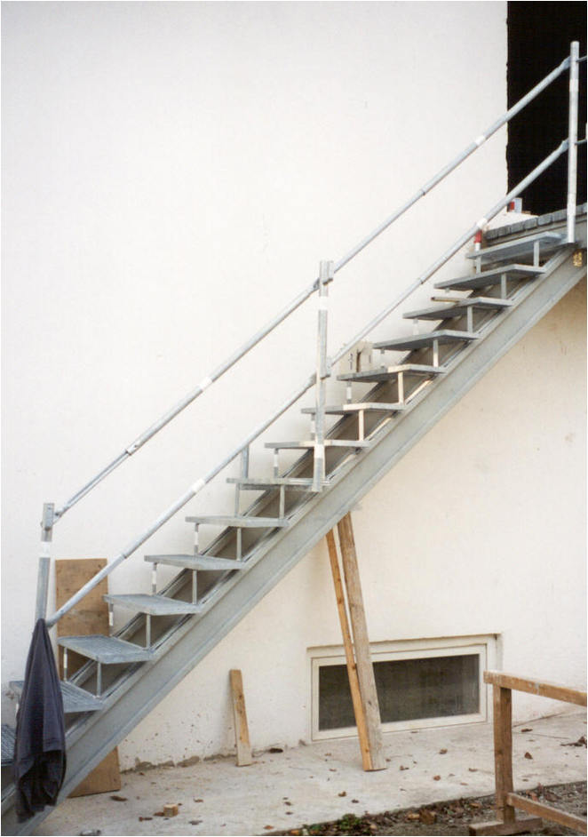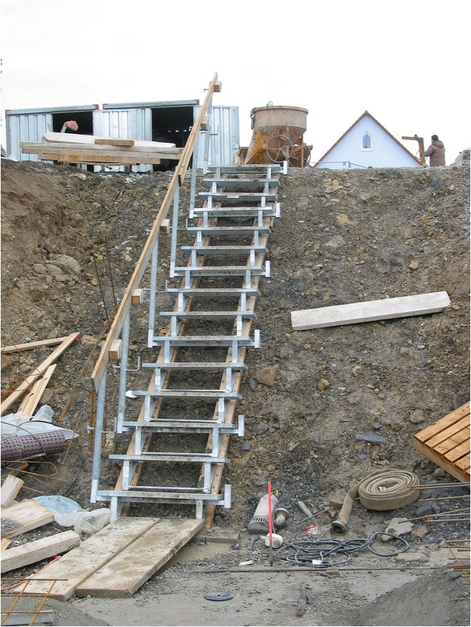 Die Layher Baustellen-Treppe ist ideal, um Geschosse, Böschungen und Baugruben sicher begehen zu können. Einfach auf zwei bauseitigen Kanthölzern (Schalungsträgern), unten beginnend, annageln.