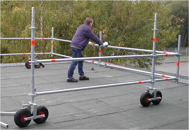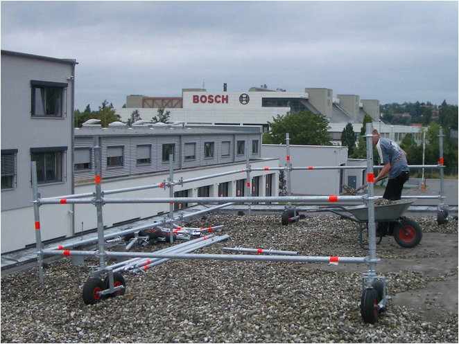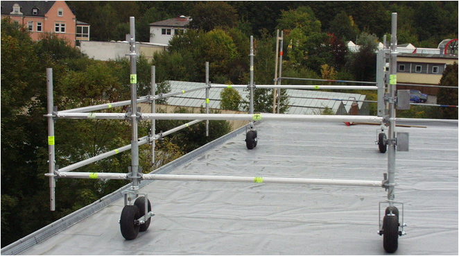 Der schnell montierte Flachdachschutz für Flachdächer bis 40 m über Gelände und einer max. Neigung von 5° .Vorwiegend für kurzzeitige Prüf- und Ausbesserungsarbeiten im Attikabereich.