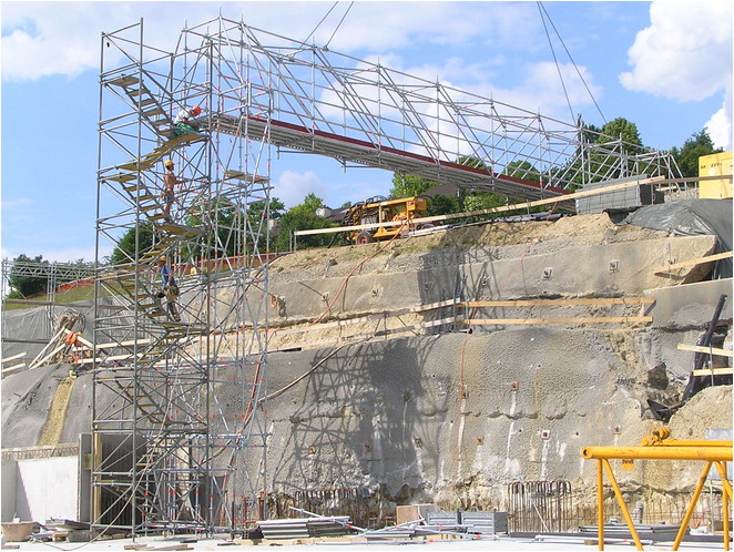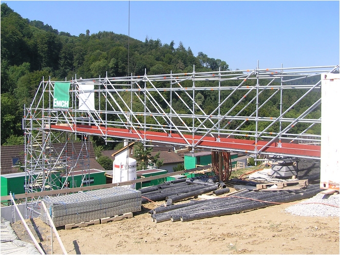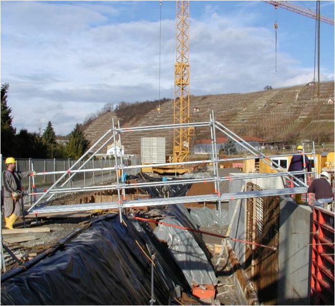 Wenn die einfache Grabenbrücke mit einer Belastung bis 2 kN/m? mal nicht ausreicht, erstellen wir Ihnen mit dem Layher Allround-Gerüst auch Behelfsbrücken bis 5 kN/m2.
