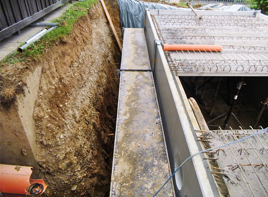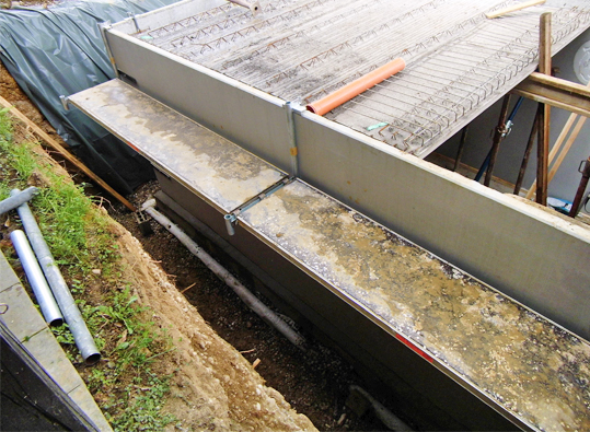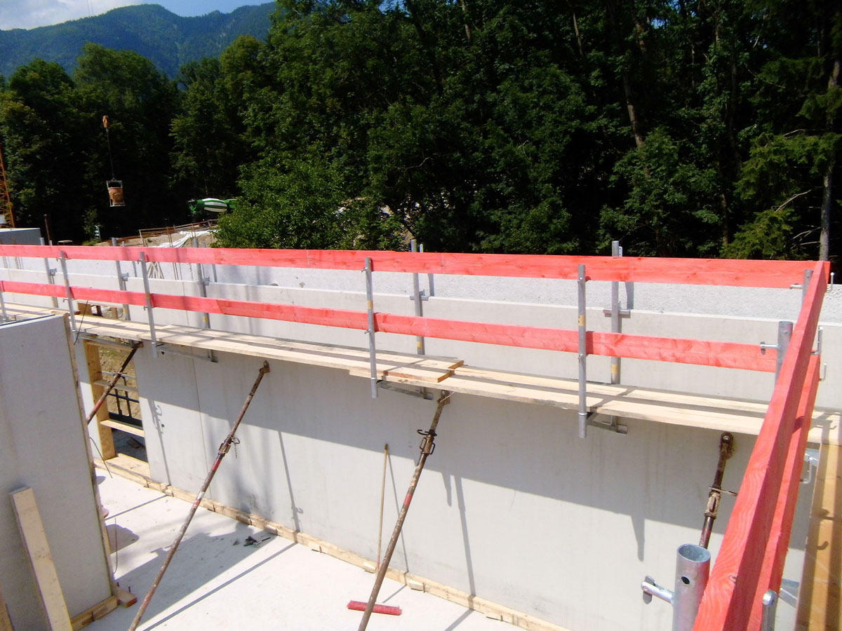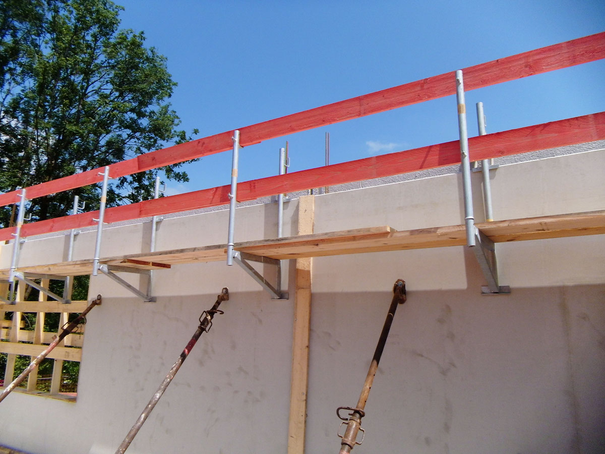 Einfache bzw. schnelle Montage an bewehrten Hohl- bzw. FT-Wänden bis 8 cm Stärke. Konsolen über die Wände hängen, Einhängehaken mit bauseitigem Leerrohr (inkl. Verschlussstopfen) versehen, mit Layher Gerüstböden bzw. systemfreien Gerüstbohlen belegen, fertig!