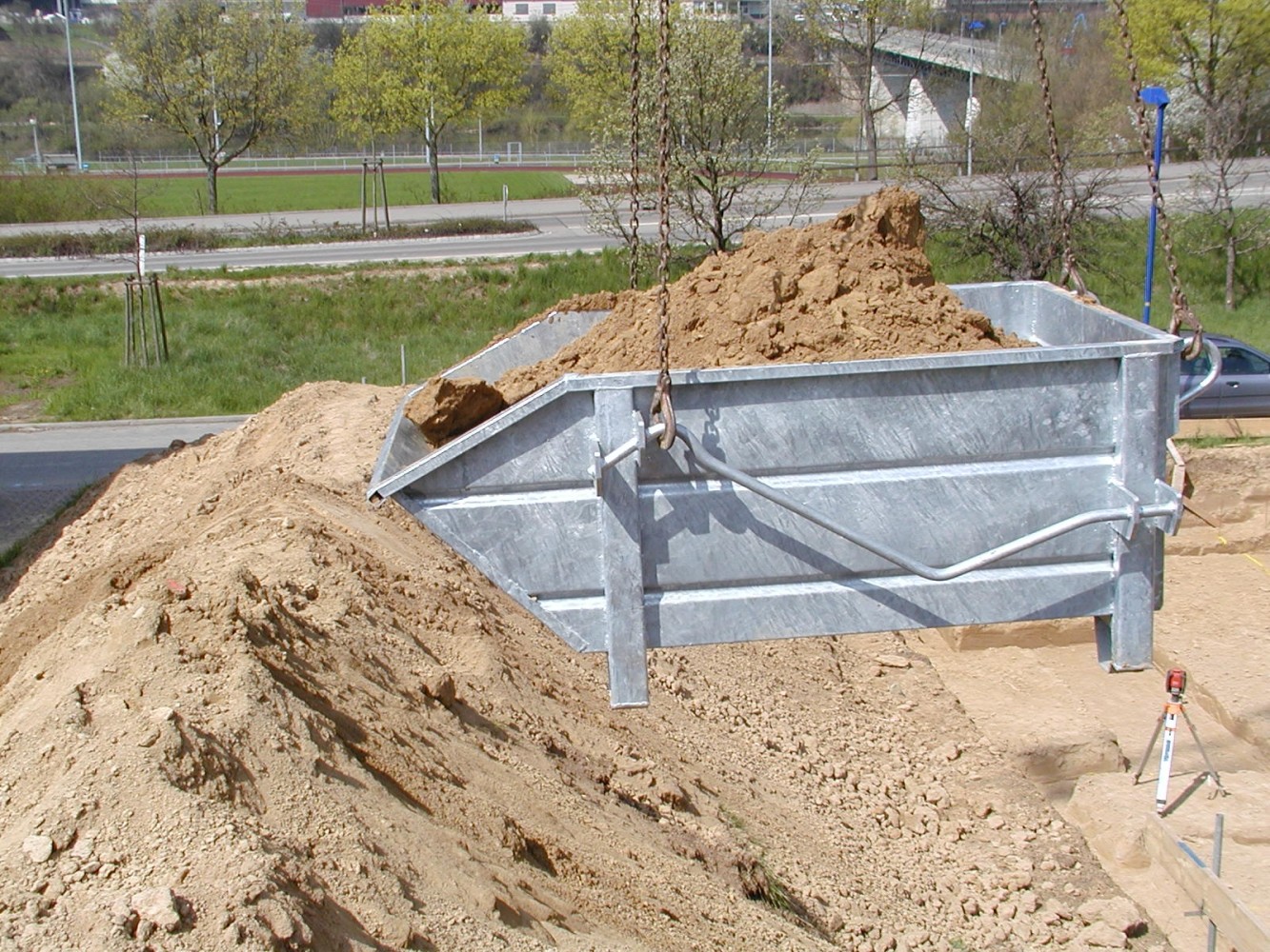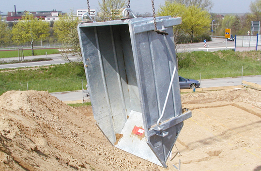 Der Layher Kipp-Container wurde speziell zur vereinfachten Entleerung und zum Transport von Schüttgütern entwickelt. Durch das Ablassen, Verfahren und Anziehen des Krangehänges wird der Kipp-Container ohne Hilfe einer zweiten Person entleert.