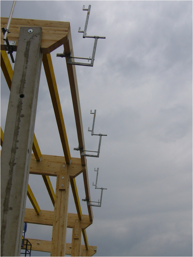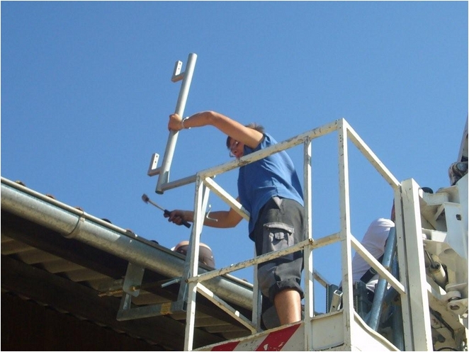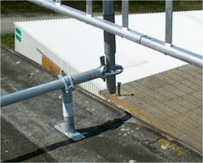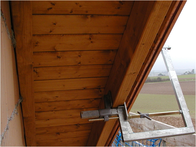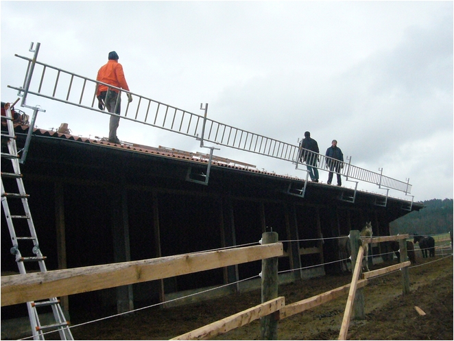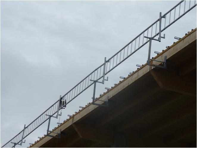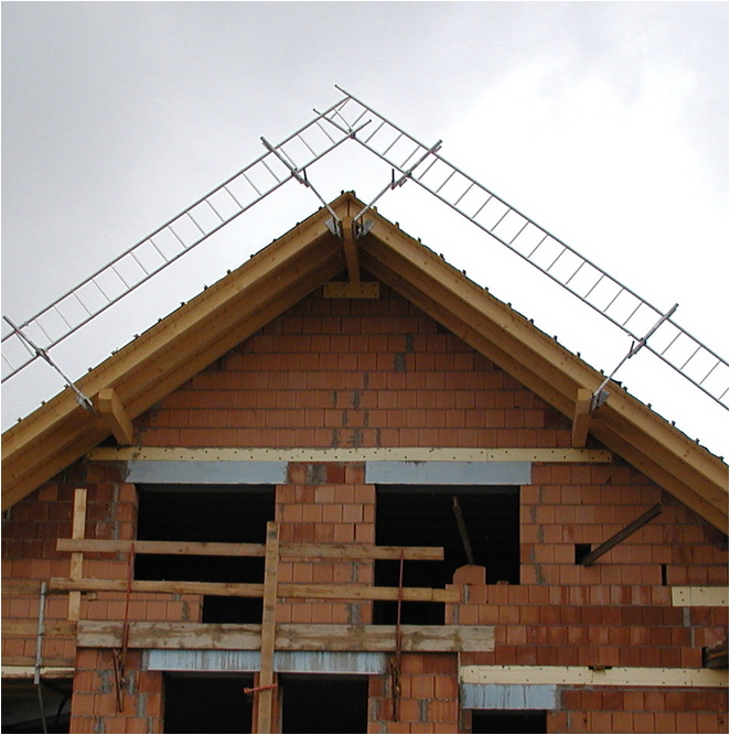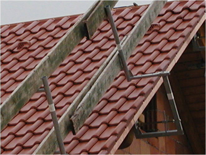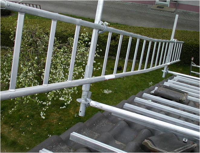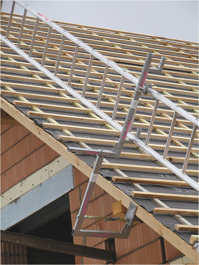 Das Layher Ortgang-Geländer ist die perfekte Ortgang-Absicherung. In Kombination mit dem Layher-Dachfang ist der Dachdecker im gesamten Dachbereich optimal vor Absturz gesichert.