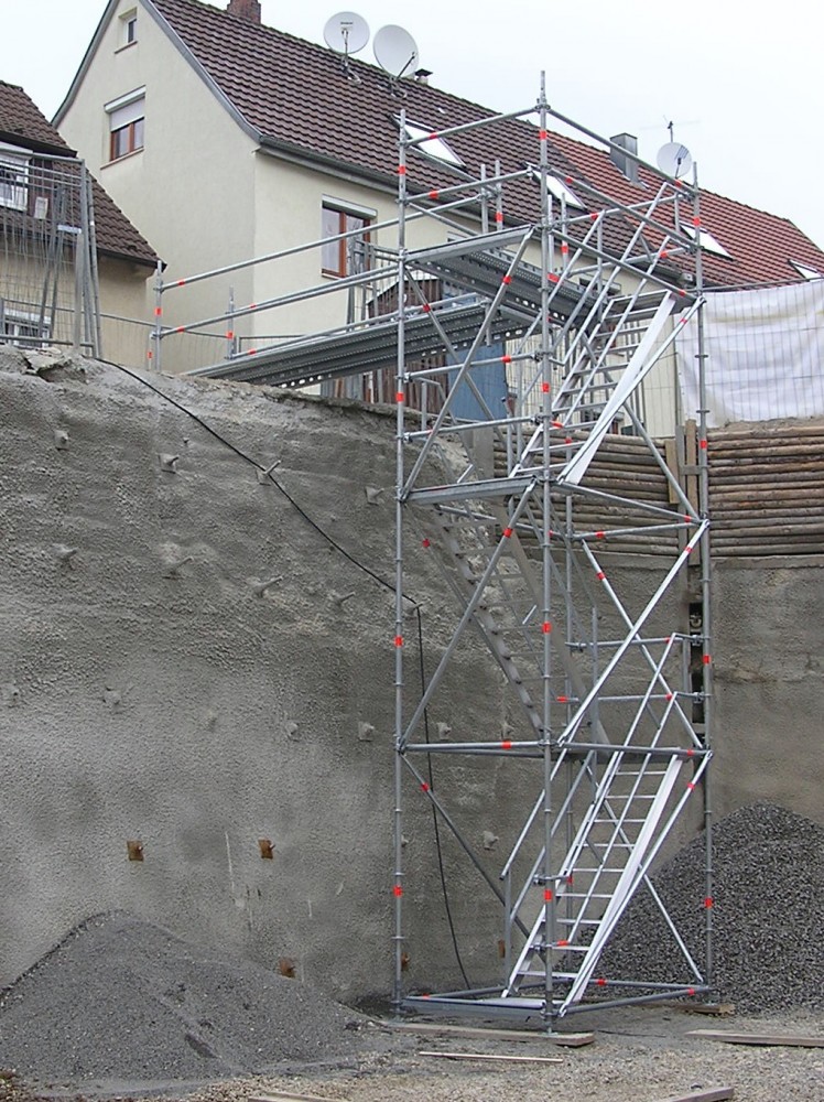 Mit der Layher Podesttreppe wird der Aufstieg in Fassadengerüsten zum Kinderspiel. Hohe Sicherheit, Schnelligkeit und Praxistauglichkeit vereint in einem Produkt! Mit der Layher Podesttreppe ist es möglich ungestört auf der Gerüstlage zu arbeiten – keine Etagenleitern stehen im Weg, Durchstiegsklappen müssen nicht permanent geschlossen werden.
