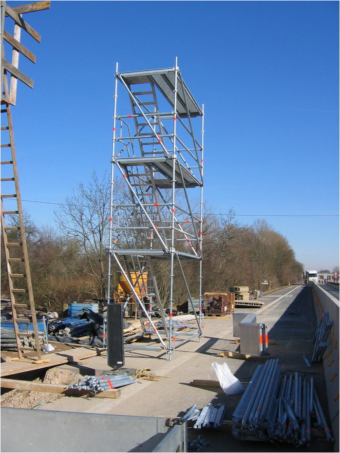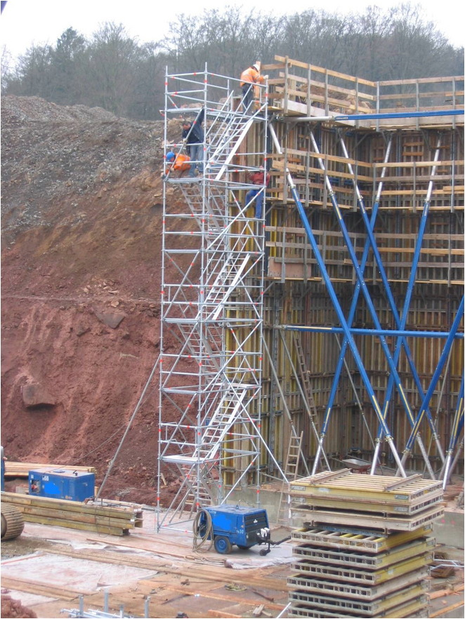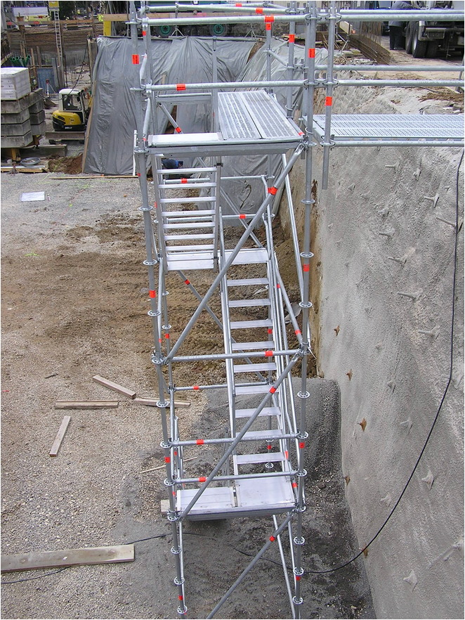Die Layher Allround Rohbau-Treppe entspricht den Vorschriften “Treppen bei Bauarbeiten” und passt in kleinste Treppenlöcher im Wohnungsbau.