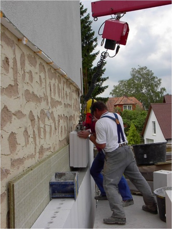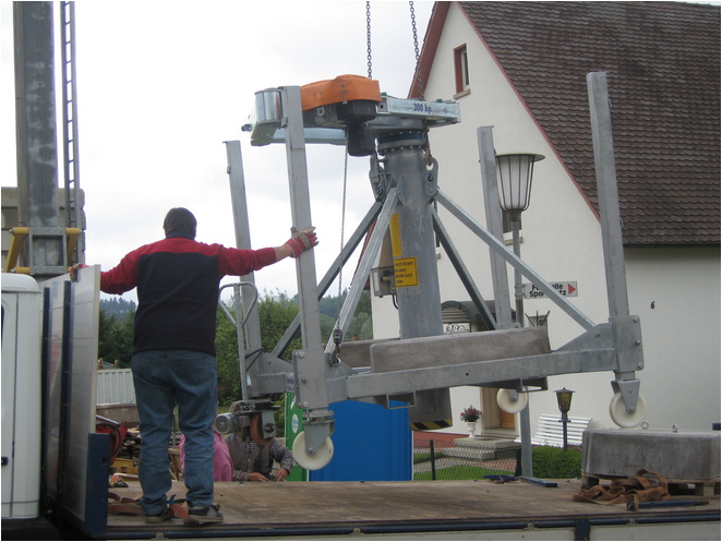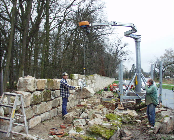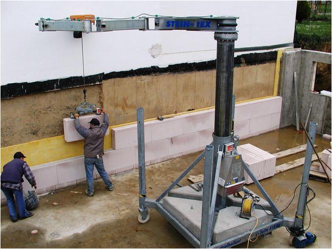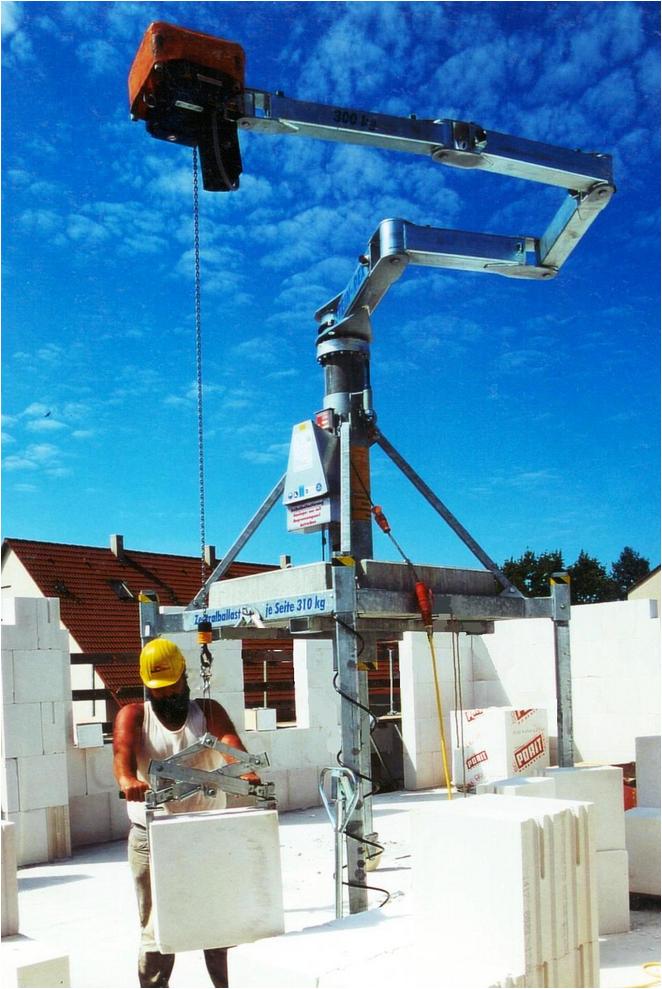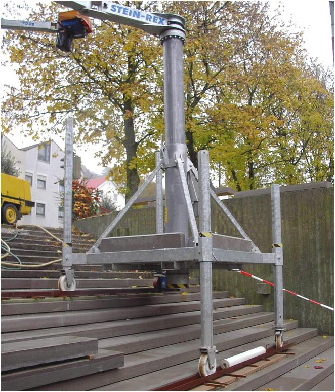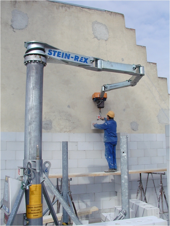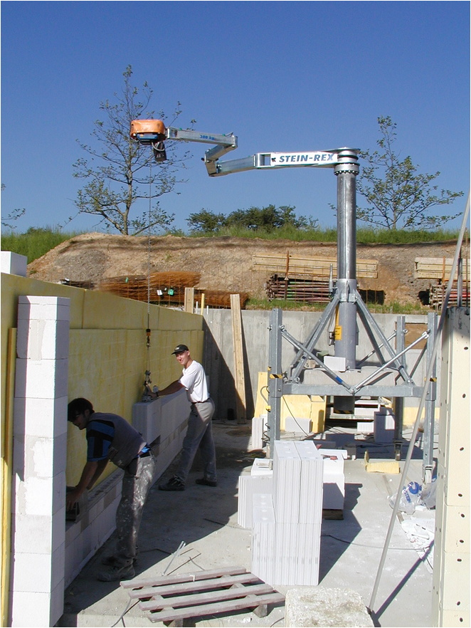 Kleinkräne werden auf der Baustelle durch Großkräne montiert und mit Ballast versorgt. Der Mehrfach-Gelenkausleger entlastet diesen Großkran, der Stein-Rex ballastiert sich selbst.