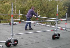 Der schnell montierte Flachdachschutz für Flachdächer bis 40 m über Gelände und einer max. Neigung von 5° .Vorwiegend für kurzzeitige Prüf- und Ausbesserungsarbeiten im Attikabereich.